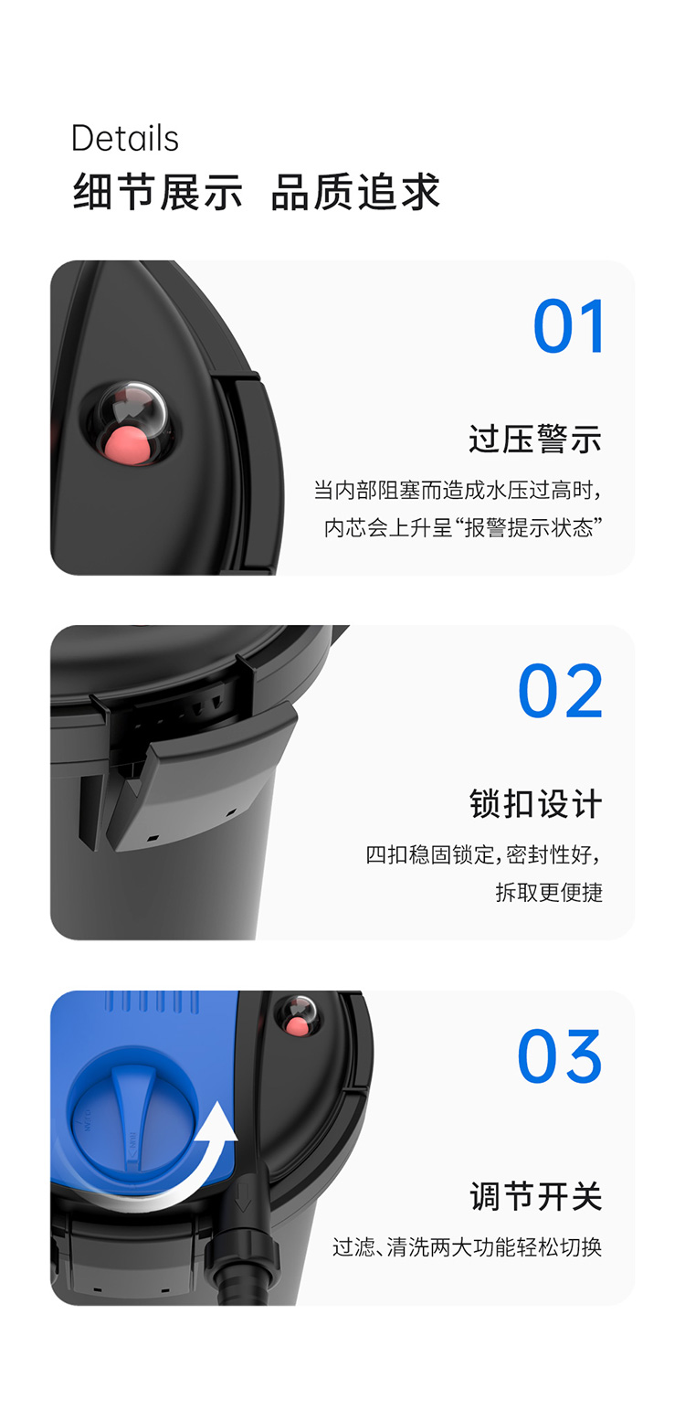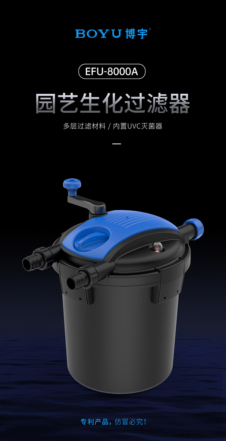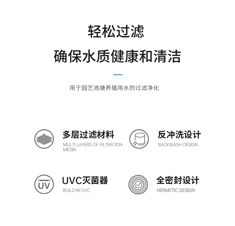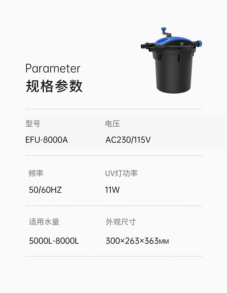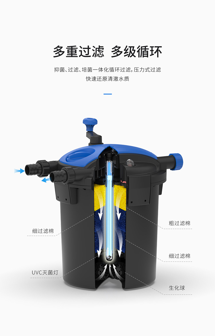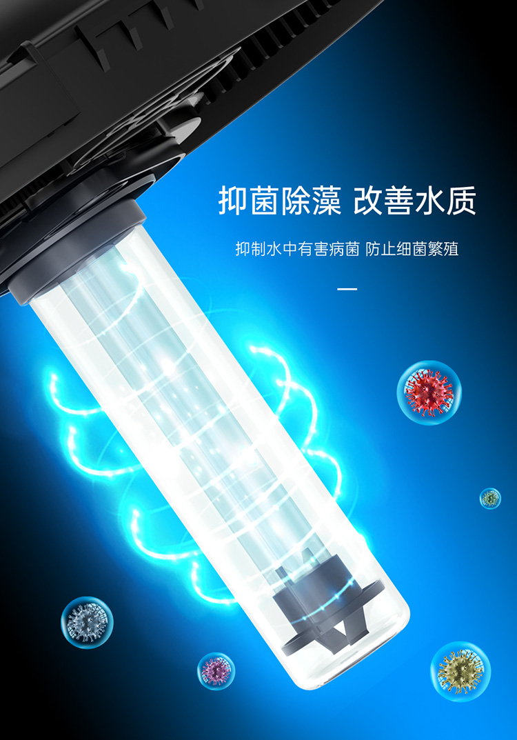 • 內(nèi)置式紫外線燈,能有效地殺死水中的藻類、病毒及有害菌;