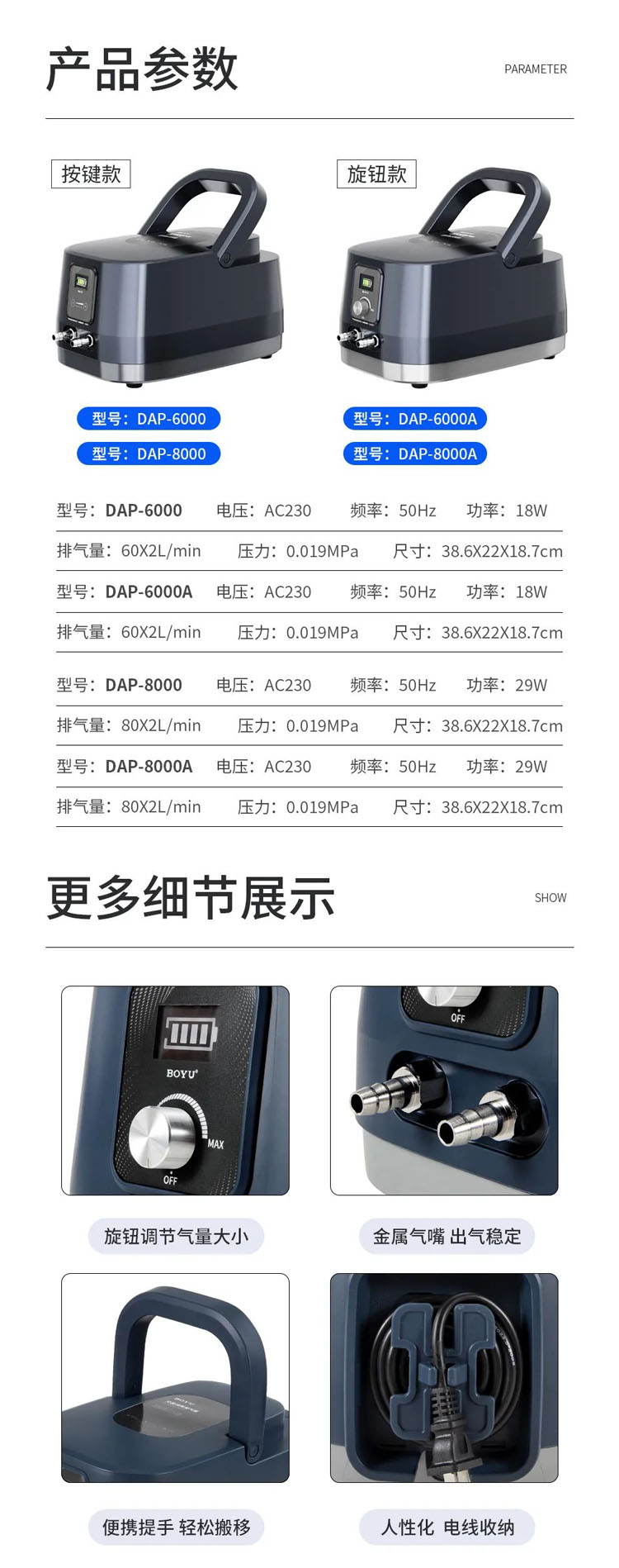 • 出氣量大,無油潤滑出氣純凈,使用安全可靠。
